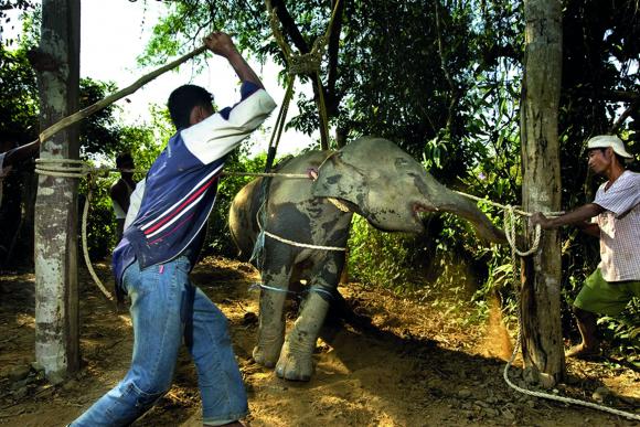 Elefantene fjernes fra mødrene sine når de er veldig små. Noen er også født i fangenskap, mens andre er blitt lokket i en felle ute i naturen. Så begynner prosessen med å bryte de ned mentalt for å tvinge dem til å adlyde. Det kalles Phajaan.